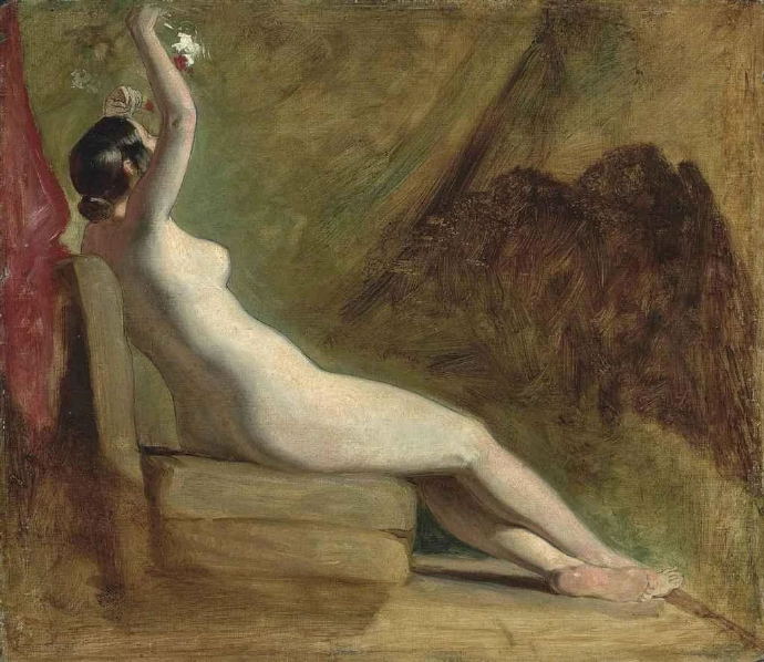 这幅威廉·埃蒂(William Etty)的《坐姿女性裸体》(Seated Female Nude,约1820-1830年代,油画木板)展现了艺术家对人体肌肤与光影的精湛掌握。画中女子优雅倚靠椅背,一臂高举,手持白色花朵,姿态自然舒展,背景以温暖的绿色与红色布料烘托,营造出亲密而感性的氛围。埃蒂以细腻笔触描绘柔润肤色与微妙明暗,被誉为英国19世纪最杰出的裸体画家之一。