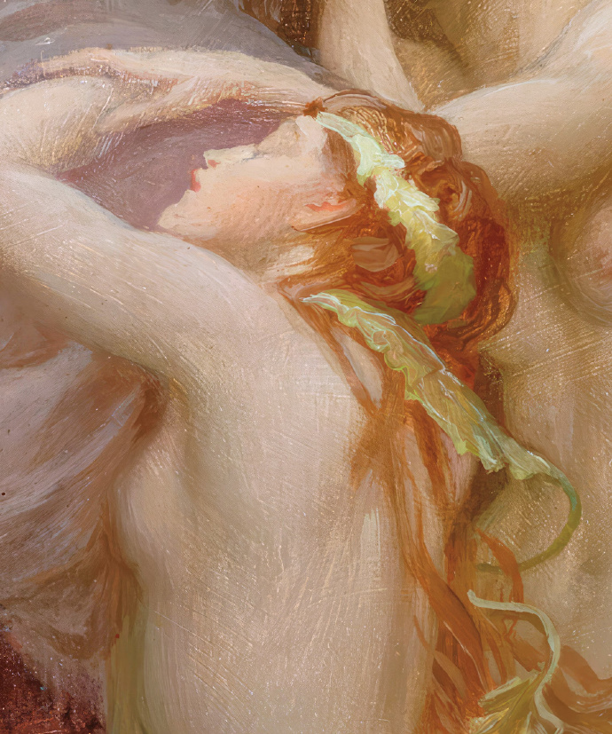 《海之旋律》(Sea Melodies)是英国古典主义画家赫伯特·詹姆斯·德雷珀(Herbert James Draper)于1904年创作的代表作,曾在皇家艺术学院展出。这幅椭圆形油画以浪漫梦幻的海洋神话为主题,描绘三位优美的海之仙女(nymphs)在岩石峭壁与湛蓝海水间,沉醉于神秘旋律。一位半人半兽的男性形象(可能是海神或萨提尔)坐在高处吹奏排笛,音符仿佛与浪花交融;下方两位赤裸的仙女相拥,一位红发女子慵懒倚靠,表情迷离陶醉,充满感官美与诗意氛围。德雷珀以精湛的学院派技法,展现光影在肌肤与海面上的细腻流动,营造出神话般的迷人梦境。