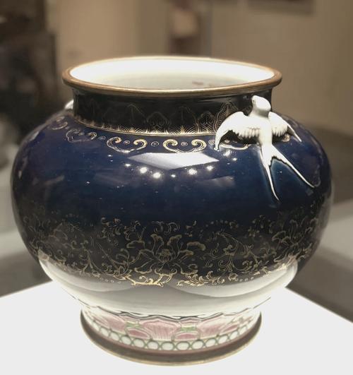 霁蓝色象征河清,燕子与“晏”谐音,整件器物寓意海晏河清、四海承平。乾隆时期的粉彩瓷器工艺达到高峰,品种丰富,装饰技法多样,绘画水平高超,器型精美,这件瓷尊正是这一时期工艺的典型代表。