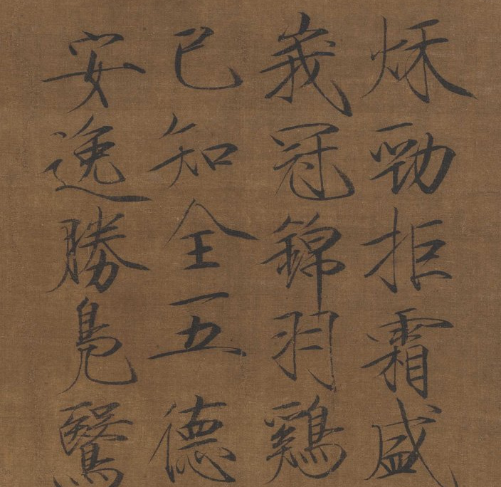《芙蓉锦鸡图》画如其人,整幅图纤巧富丽,技巧虽高,构思虽巧,却缺少大丈夫气。赵佶在图的右上角题了一首诗:“秋劲拒霜盛,峨冠锦羽鸡;已知全五德,安逸胜凫鹥。”锦鸡就是雉,按儒家“瑞应”说,它的出现是“圣王”出世的象征。于是这幅花鸟画就有了政治意义。古人称鸡有“五德”:“头上有冠是文,脚下雄健是武;临敌敢斗是勇;见食呼友是仁;按时报晓是信。”赵佶将自己比作“五德”俱全的锦鸡,想要安逸太平,却怎知会有“靖康之难”!观画中赵佶的自题诗,可发现赵佶画这只五彩斑斓的大锦鸡,是为了颂扬儒家文、武、勇、仁、信这五种伦理品德。此画设色浓丽,晕染细腻,传达出皇家的雍容富贵气派。