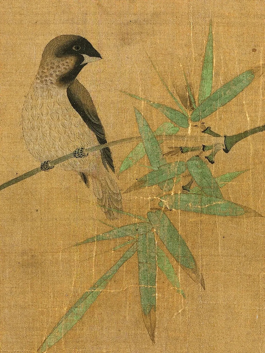 宋徽宗赵佶画的花鸟画《竹禽图》中的两只鸟飞得最远。它们飞到了美国大都会博物馆。这幅《竹禽图》横55.4厘米,纵33.8厘米。宋人花鸟画都是以小品画见长,又以精细而见功。此画也不例外。在粗略的崖石间伸出两枝翠竹,一上一下形成一个侧着的“V”字。竹枝和竹叶都没有勾勒,此画法与赵佶的《芙蓉锦鸡图》等以往的画作有所不同。