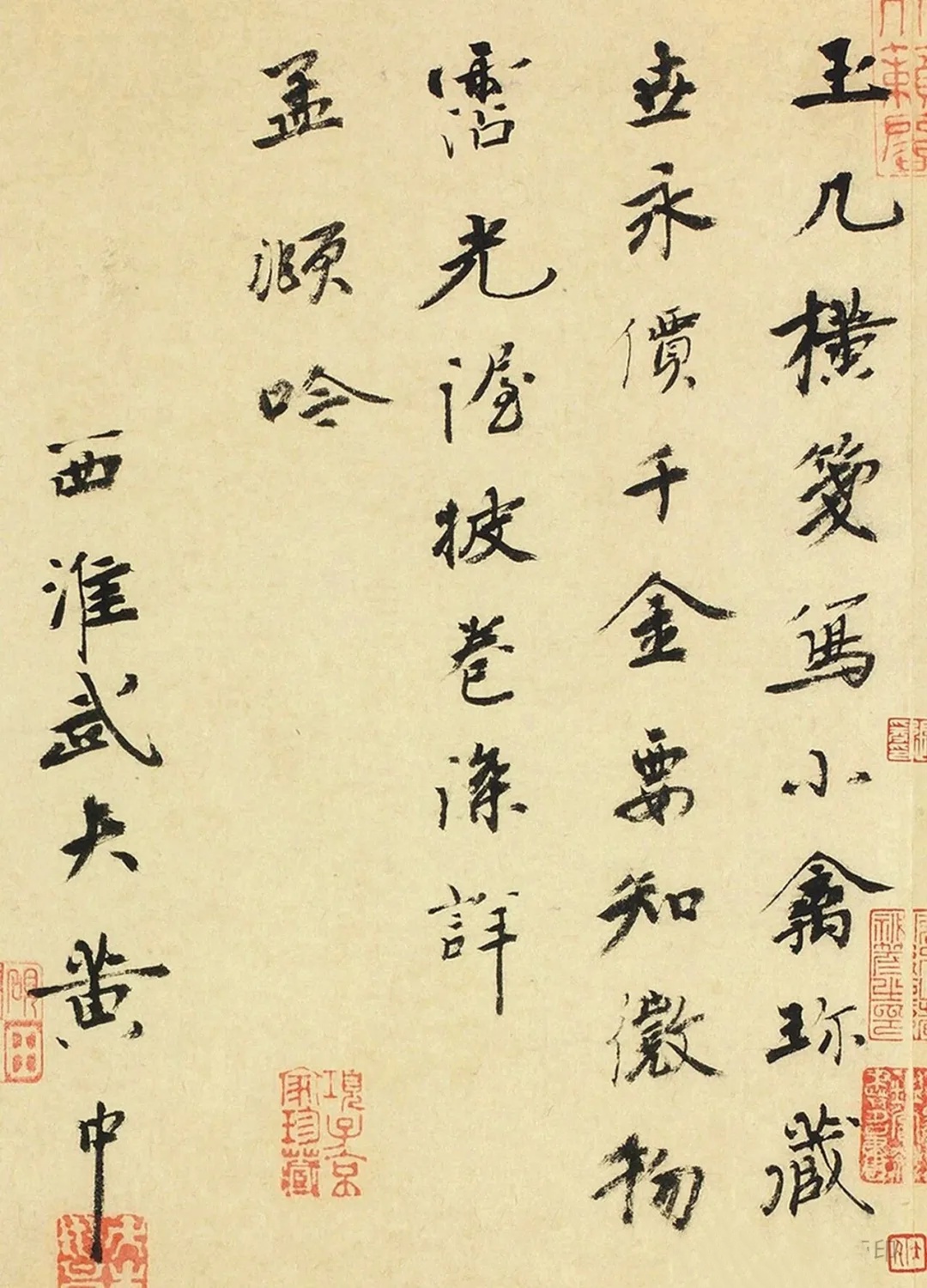 黄中在《竹禽图卷》留下了一则七言诗题跋:玉几横笺写小禽,珍藏世永价千金。要知微物霑光渥,披卷深详孟吟。西淮武夫黄中。