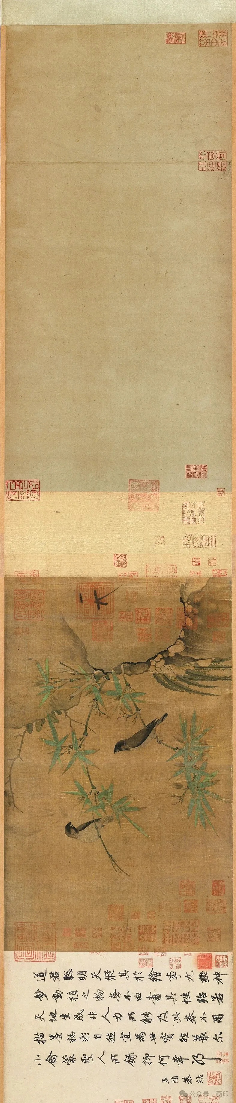 《竹禽图卷》流传有绪。南宋时被高宗内府收藏。由宋入元后,被宋室后裔、元代大书画家赵孟收藏,并题跋:道君聪明天纵,其于绘事,尤极神妙。动植之物无不曲尽其性,殆若天地生成,非人力所能及。此卷不用描墨,粉彩自然,宜为世宝。然蕞尔小禽蒙圣人所录,抑何幸耶。孟恭跋。