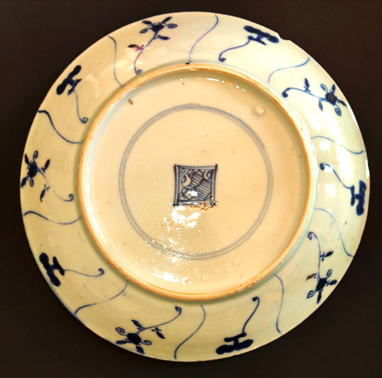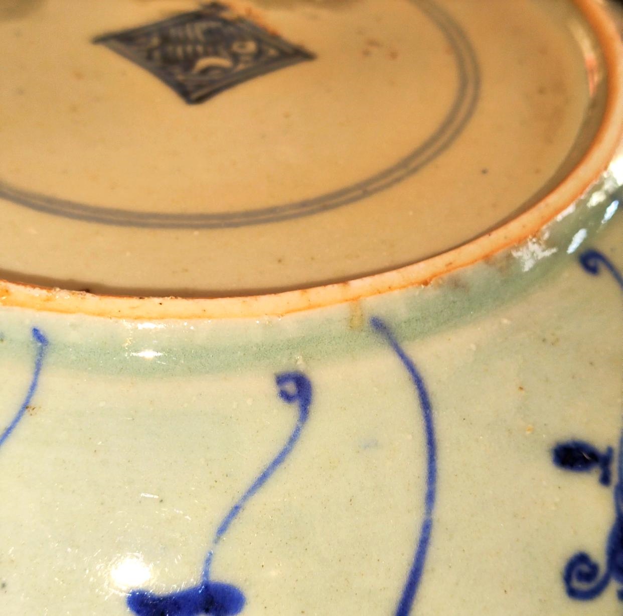 今天要介绍的这件清代青花灵芝纹盘,敞口设计,弧形浅壁,平底,圈足,胎体轻薄,胎质坚硬洁净。通体釉色白中泛微青,外底署有青花“花押”款。盘身纹样为青花折枝灵芝纹,青花发色淡雅,用细线绘制纹饰,灵芝花卉纹随着盘身曲线的变化而变动,灵活规整。青花色泽淡雅,呈色蓝中带灰,含蓄幽静,给人以清新悦目、优雅脱俗之感。