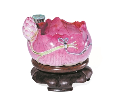 清代粉彩荷花形水丞(图2),以瓷为胎,通透柔净。器身雕琢盛开荷花形,荷茎、花根环绕器身,上雕莲蓬及含苞荷花作饰,刀法灵动,局部之处更是精工细琢,荷花花瓣、莲蓬叶脉线条皆清晰流畅,花随风动的优美之态栩栩如生。水丞,又名水中丞,为文房重要器具之一,置于书案,以贮砚水。而荷花素有“出淤泥而不染,濯清涟而不妖”之美赞,象征正直、高洁之品。以之为水丞,高雅清朗,可谓一洗人间氛垢矣,清心乐志。
