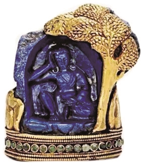 图2即为公元前288年—公元前281年的古希腊时期亚历山大大帝的部将色雷斯王利西马柯斯铸造发行的金币正面图案,就是亚历山大大帝的公羊角头像,此币是希腊化时代最著名的首例神话人像币,头像上的公羊角就象征着亚历山大访问埃及锡瓦阿蒙神庙祈求神谕,自称是太阳神阿蒙之子的身份的象征,更是象征希腊和埃及的复合神宙斯阿蒙。这枚钱币最引人注目的特点是亚历山大炽热的目光。这种钱币在历史上的希腊化地区影响巨大,而大夏(巴克特利亚)正是位于亚历山大帝国的东部,即现在的阿富汗一带。那枚戒指上面青金石戒面上刻的形象,就是来源于此。