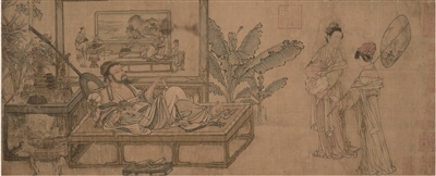 卧榻上面的主人公一身燕居之服,右手轻拈拂尘,左手漫拄书卷,背倚隐囊,一双方鞋脱在踏床上。隐囊后面竖一把阮咸。画面右方有侍女二人,一人捧袱,一人肩扇。卧榻后面是一架座屏,芭蕉、翠竹分别点缀于屏风两侧。屏面又嵌了一幅画。