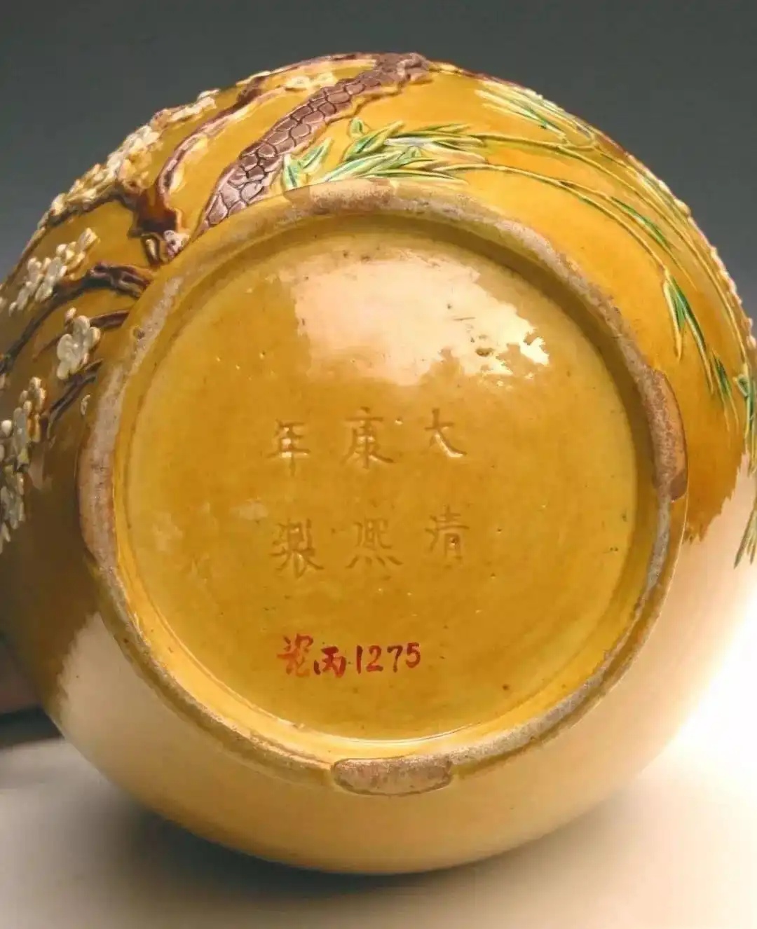 清康熙款黄釉凸雕松竹梅三彩瓶