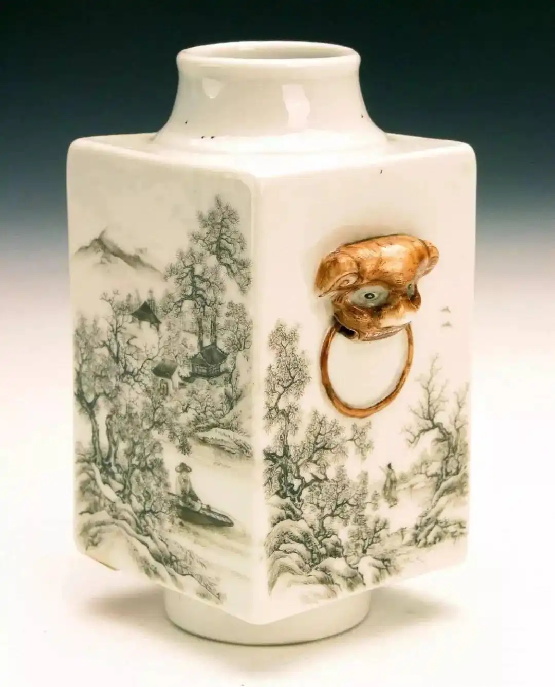 清乾隆款墨彩人物双兽耳小灯笼瓶