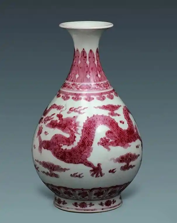瓶撇口,短颈,溜肩,鼓腹,圈足。通体釉里红装饰,颈部为蕉叶纹,肩部为缠枝灵芝纹、如意云肩,腹部为云龙纹,胫部为莲瓣纹,足墙为折枝花纹,外底青花书“大清乾隆年制”六字三行篆书款。
