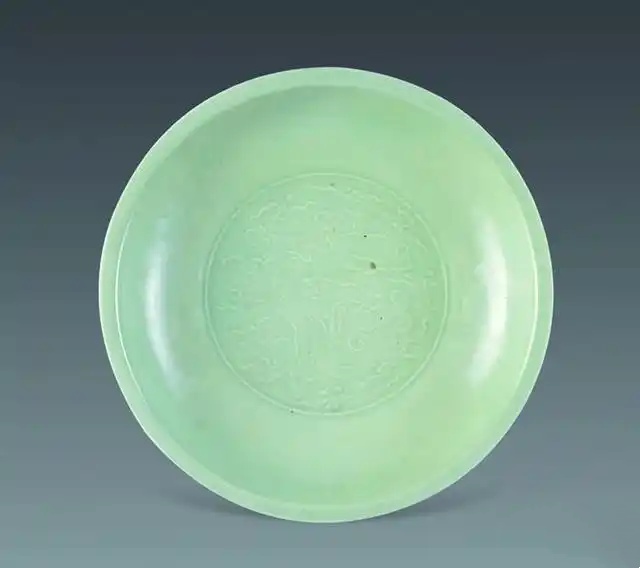 此盘形制较大,端庄规整,胎体轻薄,釉质肥厚莹润,色泽清幽,夔龙隐现,为雍正时期青釉瓷的典型器。