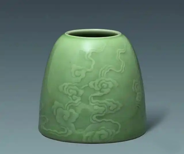 器因形似马蹄,故又称为“马蹄尊”,为文房用具。此器为康熙时期的典型器物,除冬青釉外,尚有五彩、青花和釉里红等品种。造型小巧精致,釉质温润肥腴,色泽清幽雅致,纹饰精美,刻划线条酣畅。