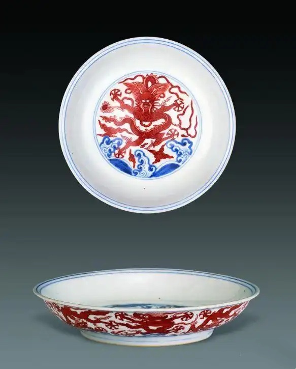 盘撇口,弧壁,平底,圈足。器青花红彩纹饰,青花绘海水纹,红彩绘龙纹,汹涌澎湃的海水泛起朵朵白色的浪花,九条形态各异的红彩蛟龙闹海,飞腾其间,勇猛矫健,有叱咤风云之势。外底双圈内青花书“大明万历年制”六字二行楷书款。