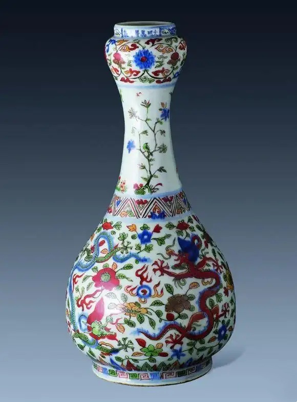 瓶蒜头式口,长颈,垂圆腹,圈足。通体绘五彩纹饰,口沿绘忍冬纹并青花横书“大明万历年制”六字楷书款,口部绘缠枝莲纹,颈部绘古树、飞鸟和飞蝶纹,肩部绘折线纹内绘花朵纹,腹部绘穿花龙纹,足墙绘回纹。