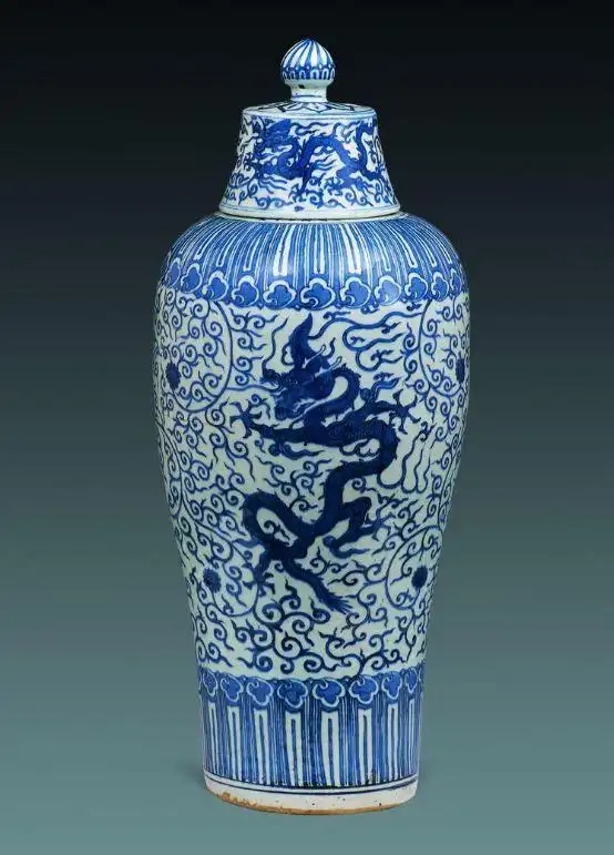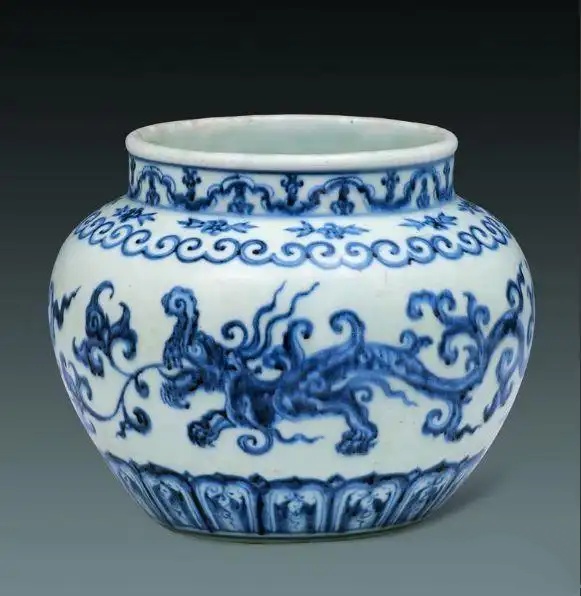 罐直口,短颈,鼓腹,圈足。通体青花纹饰,颈绘如意云头纹,肩绘朵花和勾云纹,腹绘夔龙衔花纹,胫处饰莲瓣纹,外底青花双圈内书“大明宣德年制”六字二行楷书款。