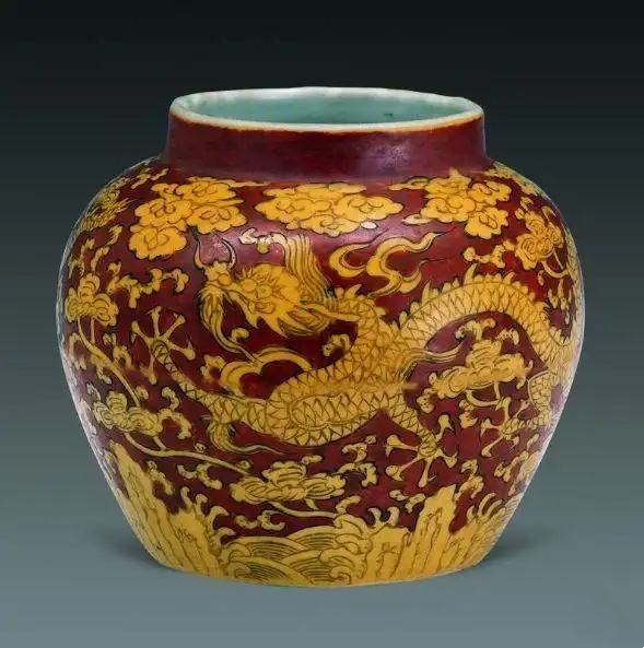 明嘉靖瓷器由于不能烧制釉里红,而大量以矾红彩作装饰。明代黄一正《事物绀珠》云:“嘉靖窑回青盛作,鲜红土断绝,烧法亦不如前,惟可烧矾红色。”故嘉靖的传世品以矾红描绘纹饰或以矾红彩涂地的瓷器多见,时代特征鲜明。此器造型饱满,色彩艳丽多姿,龙纹生动逼真,为嘉靖红地黄彩瓷的上乘佳作。民国时期多有仿制嘉靖红地黄彩器,其造型欠规整,胎质粗松,纹饰笔法呆板,外底釉不闪青而泛白。