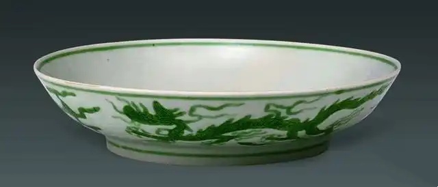 盘撇口,弧壁,塌底,圈足。内心与外壁均以白釉为地刻填绿彩云龙纹,外底青花双圈内书“大明弘治年制”六字双行楷书款。