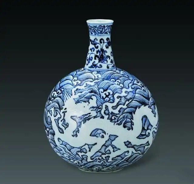 器圆口微外撇,长颈自上至下渐阔,扁圆式腹,椭圆形浅圈足。口边、颈部白地青花绘卷草纹和缠枝莲纹,腹部青花满绘海水纹为地,刻划二条白色行龙,回首观望,奋爪腾身,履水而前,波涛滚滚、汹涌澎湃,卷起白浪,有“惊涛拍岸、卷起千堆雪”之感,更衬托出游龙凶猛强悍、气势豪放、气吞山河之状。