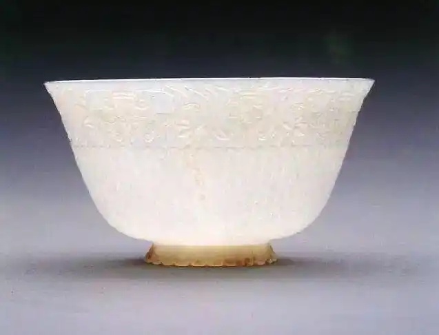通过与西域痕都斯坦玉器的比较,宫廷仿制的“西番作”虽然部分器物的胎壁也很薄,但从整体上看还是要稍微厚一些,材质主要是和田产的上等白玉或黄玉。这些中西结合的玉器直接影响了中国玉器的制作风格,近现代玉器大多造型是中式的,而装饰纹样是西式的,足见其影响深远。
