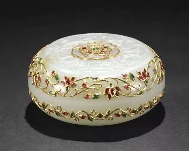 (2)镶嵌装饰,富贵华丽。痕都斯坦玉器的表面不像中国玉器那样光洁平滑,或仅用阴线浮雕来作装饰,而是善用纤细的金丝或银丝将花纹的轮廓勾出,表现出器物的华丽。另外,痕都斯坦玉器上多镶嵌各种玻璃、宝石、金银片或玉片。这与中原传统人文的雅致意韵全然不同。