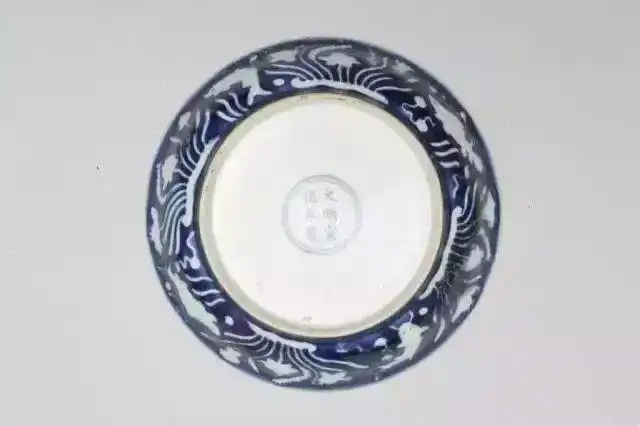 蓝釉白花瓷器是元代景德镇窑的创新品种,其蓝白对比鲜明,具有较好的装饰效果。明代宣德时的景德镇窑将这一装饰品种加以发展,图案刻画更加细腻,造型品种及装饰题材亦大为增多,造型有盘、碗、尊等,装饰题材有龙、鱼莲、萱草、折枝花果、缠枝花等。应引起注意的是,清代康熙时景德镇御窑厂曾仿烧过宣德蓝釉白花鱼莲纹盘,但图案刻画不如宣德时作品细腻。