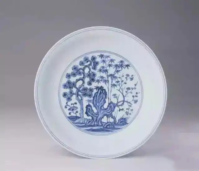 宣德青花瓷器造型敦厚端庄,釉面青亮,纹饰细腻豪放,笔法潇洒,一向被列为明代青花之冠。此盘主题纹饰为松竹梅纹。松竹梅世称“岁寒三友” ,寓意高风亮节。外壁绘画的庭园仕女图为研究明代贵族妇女的生活提供了宝贵的资料。由于宣德时期青花原料数量较少,因此在青花器上绘制人物图案者为数不多,此器则更显珍贵。