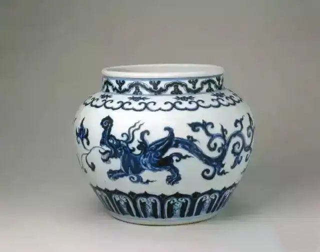 罐直口,鼓腹,内圈足。内外施白釉,外饰青花纹样。颈与肩部饰如意头纹。腹部绘2只首尾相连的夔龙衔花纹。近底处绘一周仰莲瓣纹。底施白釉,青花双圈内楷书“大明宣德年制”六字款。