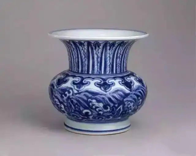 尊广口,扁圆腹,圈足。通体绘青花纹饰,颈部绘蕉叶纹,腹部绘海水波涛,海水上为如意云头纹。足底青花双圈内有青花楷书“大明宣德年制”六字款。
