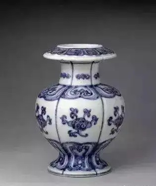 尊折沿口,直颈,鼓腹,外撇足,台阶式内底。通体呈六瓣瓜棱形。青花装饰。口沿饰莲瓣纹,颈饰圆圈纹,肩饰莲瓣纹,腹饰折枝灵芝纹,近足处饰仰覆莲瓣纹。圈足内施白釉。外底署青花楷体“大明宣德年制”六字双行款,外围青花双线圈。