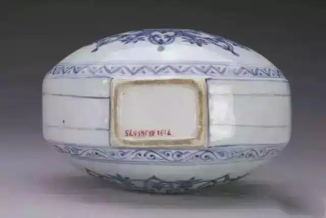 此葫芦扁壶为明永乐时景德镇御窑厂的创新器形,宣德朝继续烧造,品种有白釉、青花等,造型与纹饰皆仿自西亚伊斯兰工艺品。明永乐朝制品不署年款,宣德制品一般则署年款。