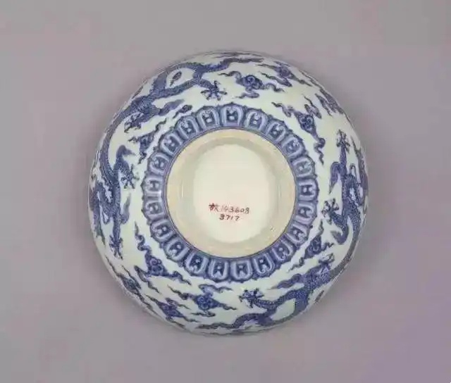碗敞口,方唇,浅腹,圈足。里白釉无纹饰。外青花装饰。口饰青花线两道,壁饰祥云双龙,近底处饰莲瓣纹,足墙饰如意云头纹。口沿下从右向左横书楷体“大明宣德年制”六字一行款。