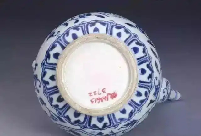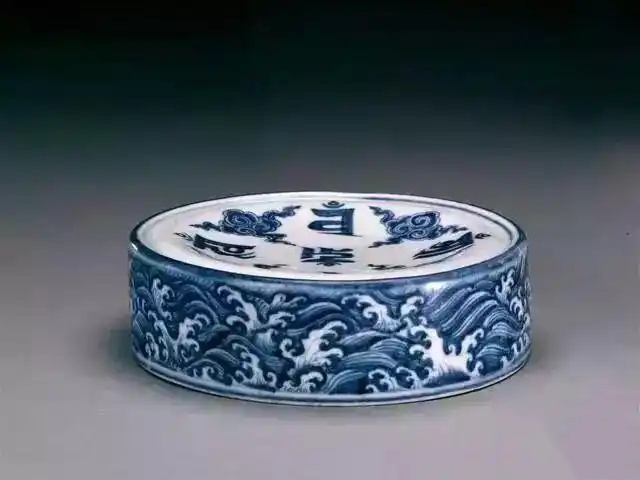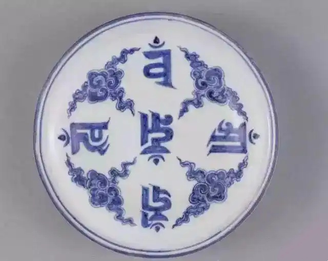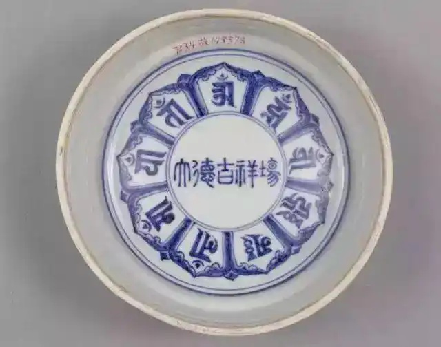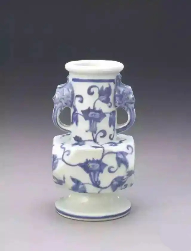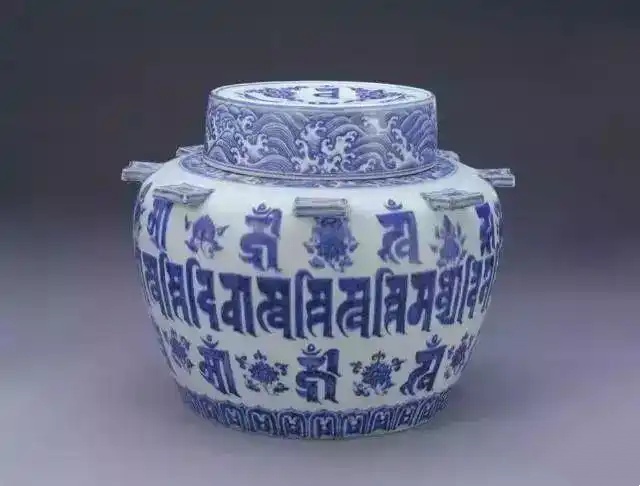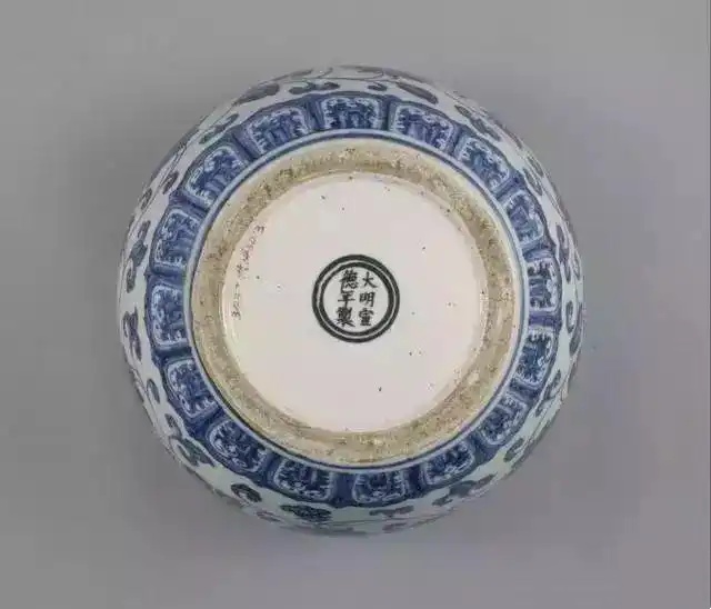 此器在宣德青花瓷中极为少见,其造型、花纹均充满宗教含义,当为佛教徒作道场时所用的法器,是景德镇专为宫廷烧制的佛事用具。