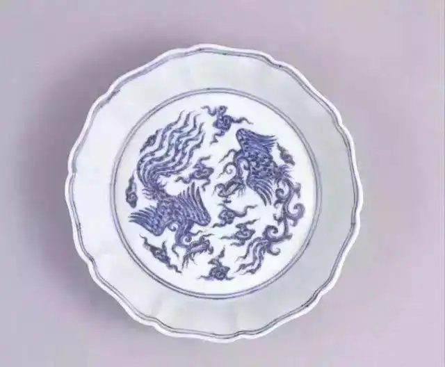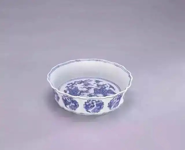 洗呈五葵瓣形,里心微凸起。通体青花装饰。口沿内外饰青花双线纹,里心绘凤、凰各一只,间以朵云。外壁绘团形凤凰10组,与葵瓣式器身相对应。底青花双圈内有“大明宣德年制”六字双行楷书款。