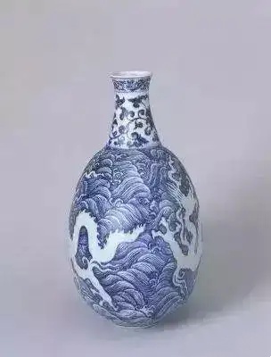 宣德时期,有“诸料悉备,青花为贵”之说。此壶的装饰过程是先在瓷坯上以尖状工具勾划龙纹轮廓及龙之双目、冠发、厚唇、牙齿、爪趾、鳞等细部,然后在龙身周围用青花料满绘波涛汹涌的海水并施透明釉,入窑高温烧成。