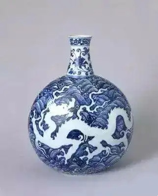 壶圆口,口边微外侈,长颈自上而下渐阔,扁圆式腹,椭圆形浅圈足。通体青花为饰,壶口及颈部绘卷草纹和缠枝莲纹各一周。腹部为青花留白海水龙纹,一条矫健威猛的白龙在苍茫无际的大海中遨游,白龙回首曲体,须发飘扬,四肢伸张,呼之欲出。青白相间的波涛上下翻滚,汹涌澎湃,又见点点黑斑,大有铺天盖地、水珠激溅、迎面而来之感。尤其是以青花点白龙双睛,愈显神采。