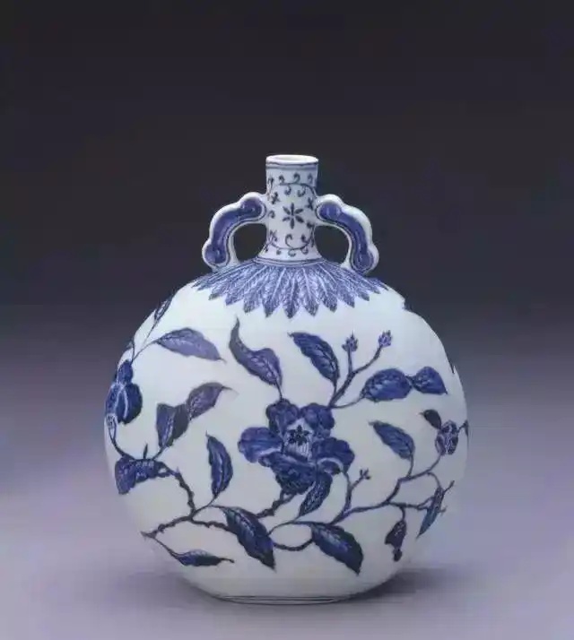 花卉题材在明代宣德瓷器装饰中占据主导地位,其中石榴花、菊花、莲花、茶花、牡丹、百合、宝相花、牵牛花等较为常见。每种器物多由2种、4种、6种或更多种类花卉通过不同形式组合在一起,形成变化丰富的花纹装饰。除花卉组合使用,也流行以单独花卉为饰,此件扁壶即为一例。其腹部两面各绘茶花一枝,笔触细腻,图案写实,别有一番情趣。