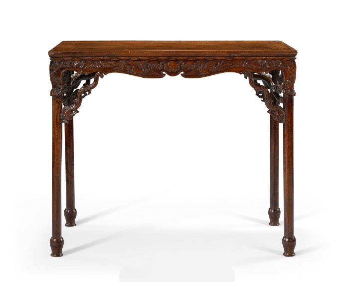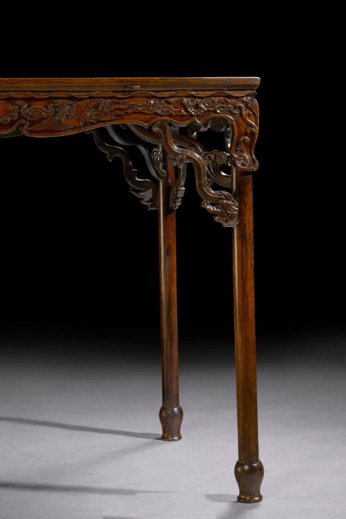 本品繁复且精緻的雕刻元素,展现出明代工匠不受制于传统家具设计规范时所能达到的高超艺术与奔放创意。其形式源自有可拆卸腿足的展腿桌,于炕上与著地间均能灵活使用。腿虽为固定结构,却刻意仿造了可拆卸桌腿的样式,足见匠心之妙。桌腿下部延伸成宝瓶足,为典型圆足的优雅变式,甚为罕见。