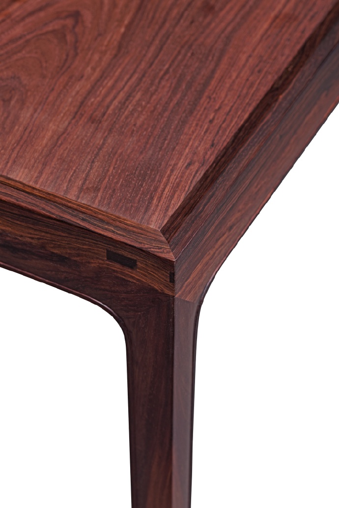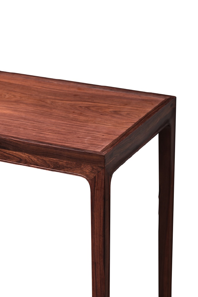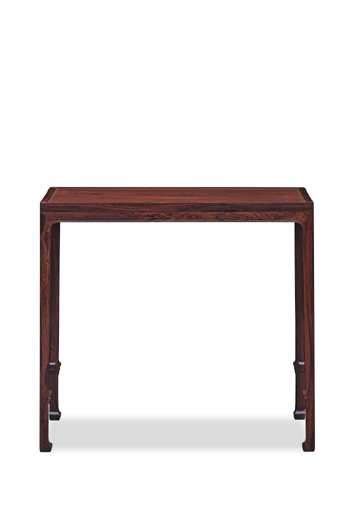 本品以海南西部紫油梨旷世老料斫制,其面板尤为卓绝——取整块紫油梨独板,油润似凝脂,抚之温润如玉。如此规格的独板大料,在今日海黄资源枯竭之际,已成绝响。案形为经典明式平头案制式,造型简练秀挺。四腿用直材,收分有度,结构稳固而视觉空灵。牙板光素,仅沿边起阳线,通体不施雕琢,以纯粹造型语言彰显明式家具之文人风骨。整体比例精妙,秀气内敛,宜于文房雅供。