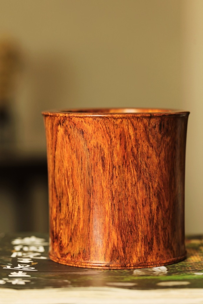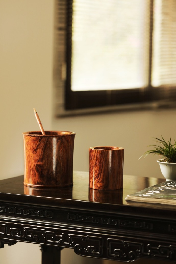 择取老料一木两器,降香浓郁,周身光素纹美质坚。整体造型端庄规整,简约雅致,尽显黄花梨瑰丽气质,又饱含文雅书卷气,文房案头陈设品香,久经摩玩承传。