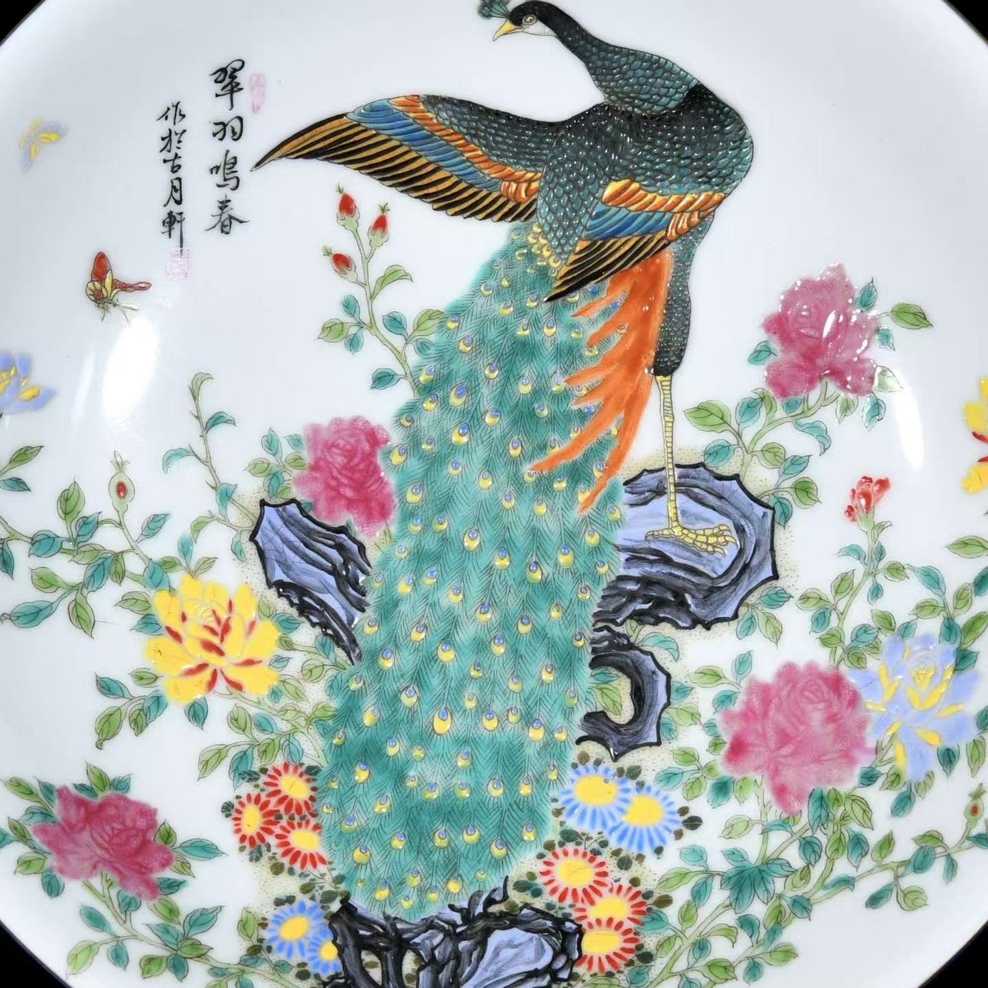 翠羽鸣春画珐琅瓷盘,作于古月轩。瓷盘直径三十厘米,制作工艺精湛,瓷盘内侧全部使用珐琅彩材料,采用珐琅彩绘画技巧,绘一只翠绿色雄性全身孔雀,孔雀站在紫蓝色太湖石假山之上,假山周围,盛开绛紫色和黄色的月季,假山基部有蓝色翠菊等花卉,两只翩跹起舞的蝴蝶,画面布局合理,色彩纯正鲜艳、层次感极强,笔触细腻,线条流畅,图案丰满精美,繁而不乱,所有画意均为釉上彩,彩绘高于瓷盘釉面,用手触摸有凸凹不平感觉,寓意非常吉祥如意。孔雀身边,黑笔书写翠羽鸣春,作于古月轩,在画款上下,用红笔绘古和月两个印章,底款使用了青花双圈和青花大清雍正年制六字款识。
