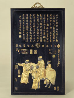 上图即为洋漆挂屏,两百多年了,还是金光灿灿的,制作工艺非常好。图案应该是唐太宗与宰相魏徵君臣一心的故事。挂在宫里给皇帝提个醒。