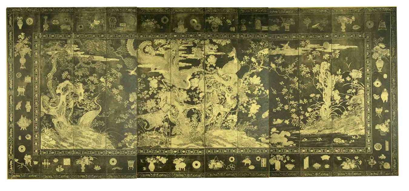 图一是故宫的收藏,算不得太精彩,尽管已经非常不错了;图二是法国人在上世纪二十年代收藏的中国大漆彩绘屏风,应该是宫里的东西,比图一故宫现存的精彩得多;图三是图二屏风的背面。