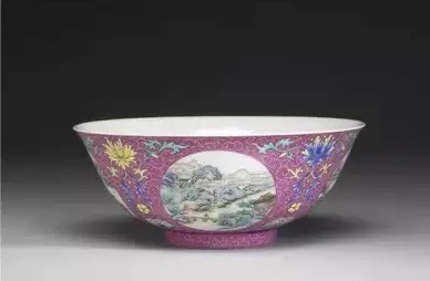 清 乾隆 磁胎洋彩紅地团花山水膳碗