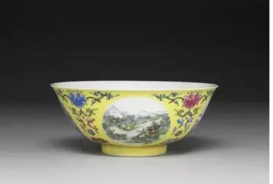 清 乾隆 磁胎洋彩黃地团花山水膳碗