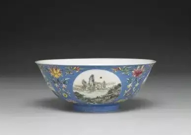 清 乾隆 磁胎洋彩蓝地团花山水膳碗