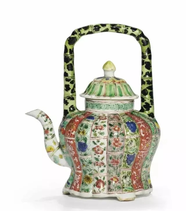 清康熙 五彩花卉纹带盖茶壶及五彩仿竹带盖茶壶