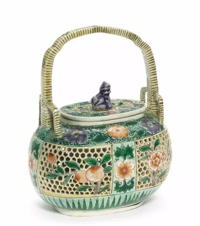 清康熙 墨地五彩透雕岁寒三友图盖壶