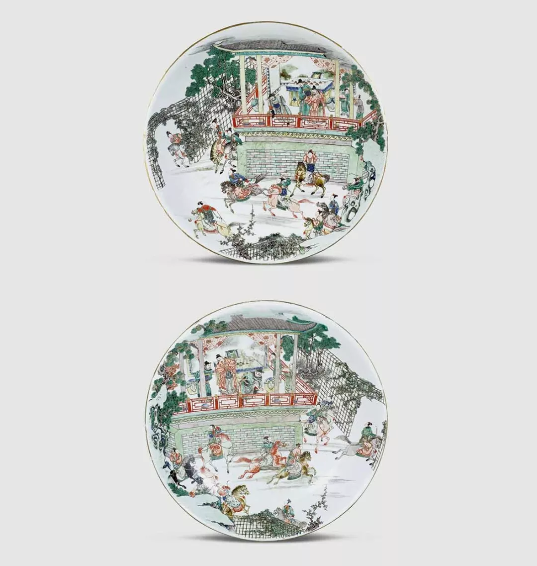 女性穿戎装、骑马战斗等形象也频频出现在康熙瓷器绘画中。康熙五彩仕女骑马图对盘,正展现了这个时期女性刚柔并济的形象特征。