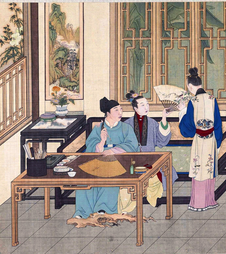 如果看大像素的图片,我们可以看到男主人在临摹女人举起的扇子上的图案,桌上的扇面上有一只没有画完的小鸟。画桌上的紫檀笔筒里有斑竹毛笔,竹扇。男女主人公的指甲都很长,但算不上夸张。