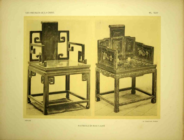 两只扶手椅,都是典型的清式书卷搭脑扶手椅。左面一张有可能是单色漆,靠背上有图案,整体造型倒也很清爽,拐子龙用得疏朗有致,下盘的拐子牙板呼应得很好,应该算是设计不错的椅子;右边一张是典型的清代围屏式扶手椅,能看出来表面大漆彩绘,实物表面应该是相当绚烂的。